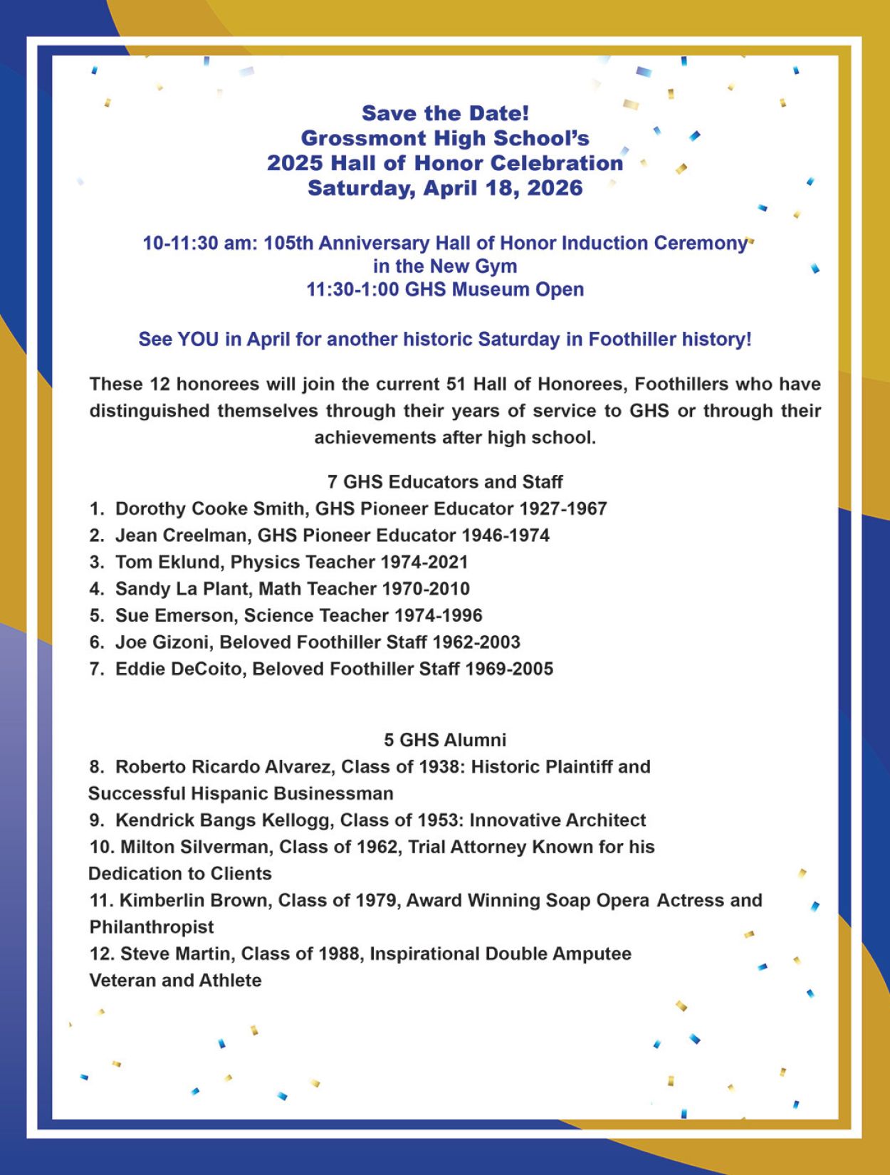 These 12 honorees will join the current 51 Hall of Honorees, Foothillers who have distinguished themselves through their years of service to GHS or through their